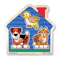 Can you find a home for the dog, cat and bird' Toddlers will love this super-sized, solid-wood puzzle with chunky half-inch-thick pieces -- it's the perfect first puzzle. Extra-large knobs make it easy for small hands to play with each brightly colored puzzle piece. Matching full-color pictures are hiding underneath each piece. Measures 12.5"H x 12.5"W x 1.7"D.