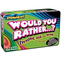 This Late Night Pocket Tin has a twisted set of questions. Would You Rather wear a t-shirt on a first date that says "I'm With Stupid" or a t-shirt that asks "Who Cut the Cheese'" "Neither" is not an option here! No matter how awful the alternatives are, it's up to the group to reach a consensus. Read the "would you rather" question, then let the conversation and laughter rip. Discuss and debate the mind-boggling options and see just how long it takes you all to agree on the absurd! To win, you must outlast your opponents by correctly predicting the group consensus to each of your questions and successfully performing your challenges. In this sick and twisted version, you'll find questions that are nauseating, bizarre and disturbing. Each is a field-tested conversation starter that is guaranteed to provoke ridiculous fun, break the ice at any party or on any road trip. If played correctly, this game might open an unique window into the twisted imaginations of friends and family! For three or more players.