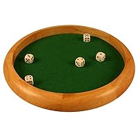This wood dice tray has an 11.5" diameter and comes with 5 white dice and a felted rolling area.