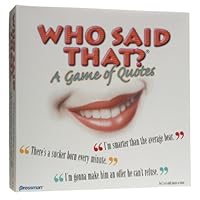 Who Said That? Is a game for everyone with 400 quotes taken from famous people, commercials, movies, cartoon characters, and more!On your team's turn, you get two quotes, one at a time.When you guess Who Said It? correctly, and in time, you move ahead two spaces on the game board. Stuck? That's okay! Ask your opponents to read the hint that comes with the quote and if you're able to give the right answer now, you still get to move ahead on the board one space.(EXAMPLE: Most people my age are dead.Hint: The Yankees' most winning manager.Did you get Casey Stengel?) Some quotes will be ones that come in a snap.Others are right at the tip of your tongue and just need that hint to help you through.Some will be tougher, but a good guess might be all you need to get your mover towards the finish-and the first player or team to do that wins!Includes game board, deck of Who Said That? Quote cards, movers, timer, and instructions.For 2 to 6 adult players or teams.