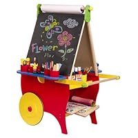 Have two little artists indulge in their art at the same time. This amazing easel is a chalkboard on one side and a dry eraser board on the other. Simply pull the paper down from the paper roll to have them draw or paint. It comes with all the storage they need for their supplies and accessories including two shelve spaces underneath and cup holder on both sides. With its large handle and rubber wheels there will be nothing in their way to let their art roam free. Features:Chalkboard on one side, dry eraser board on the other sideCup holder on one side comes with 4 storage cups for chalk, crayons and markersCup holder on other side comes with 4 non-spill paint cupsTwo shelves to store supplies and accessories underneathLarge handle and rubber wheels that wont scratch floors to move it conveniently aroundSpecifications:Overall Dimensions: 43.75" H x 31" W x 29 DWeight: 39 lbs.Age: 3+