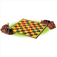 Battling dinos turn traditional checkers into a time-warped tussle! Teaches logical thinking skills, strategy, and more! Stegosaurus and Brontosaurus playing pieces battle for squares of lava, then become Tyrannosaurus Rexes when kinged. Captured dinos go into the sculpted plastic 'tar pits!