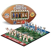 Featuring all 32 teams, this collector's Chess set is packaged in a tin and is perfect for the hard-core NFL fan! The world's greatest strategy games -- Chess and football -- merge in NFC vs. AFC Chess featuring hand-painted players and a custom football field game board. Will your conference reign supreme? The playing field heats up as the NFL battles the AFC in the ultimate Chess rivalry!! Playing pieces: Kings = Coaches (Redskins and Patriots), Queens = Quarterbacks (Colts and Packers), Bishops = Running Backs (Dolphins, Steelers, Cowboys and Rams), Knights = Kickers (Ravens, Titans, Eagles and Panthers), Rooks = Wide Receivers (Raiders, Bills, Vikings and 49ers), Pawns = Linemen (Browns, Jets, Chargers, Chiefs, Bengals, Jaguars, Texans, Broncos, Falcons, Lions, Bears, Giants, Buccaneers, Seahawks, Saints and Cardinals).2004 NFLP, LLC.