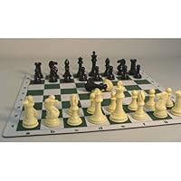 The Worldwise Imports Tournament Chess Set includes a roll-up vinyl chessboard for easy storage and transport. The green and white chess mat includes alpha/numeric markings. The triple weighted tournament plastic chess pieces feature double queens and 4in kings.