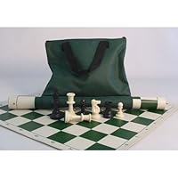 The Worldwise Imports Tournament Chess Set includes everything you need for chess fun on-the-go! The green canvas tote holds a roll up vinyl chess board and plastic chessmen. The vinyl board includes alpha/numeric markings. The tournament style chess pieces are triple weighted and feature double queens and 3.75in kings