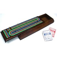 This deluxe cribbage board is made of walnut and includes metal counter pegs, and a deck of cards. There is room for storage for two decks of cards to allow this to set to be ready to use at home or wherever you choose to take it.